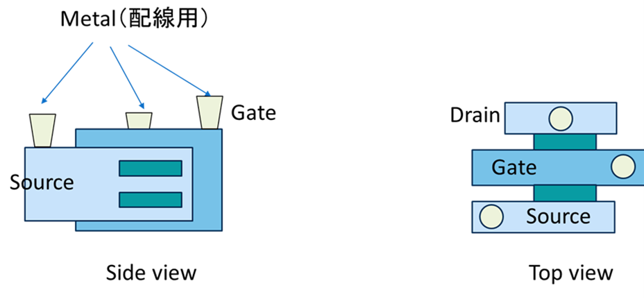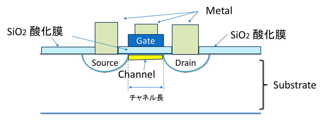 上記は、FET(Field Effect Transistor:電解効果トランジスタの部分に注目した断面図の例です。電気を導通するのは、Metal、Gate、Source、Drainで、絶縁体は酸化膜SiO2です。Channelの部分はGateに与えられるバイアス電圧により、ON/OFFされます。このように、プレーナ型ではGateの下にあるチャネルのみがトランジスタの導通に関与します。
