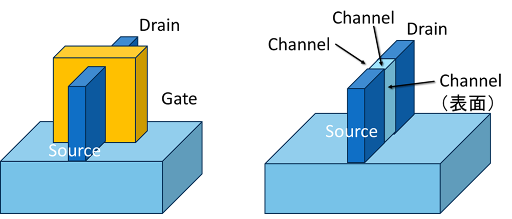 数ミクロンからサブミクロン(~0.1um)のプロセスノードでは、このようなシリコン基板の表面に回路を集積化するのが主流でした。ところが近年微細化がさらに進んで、数十ナノメータのプロセスが使われるようになると、プレーナ型ではチャネル長が小さく(ソース、ドレイン間の距離が近く)なり過ぎて、いわゆる短チャネル効果(short-channel effect)などにより正常なトランジスタの動作が保証できなくなってきました。