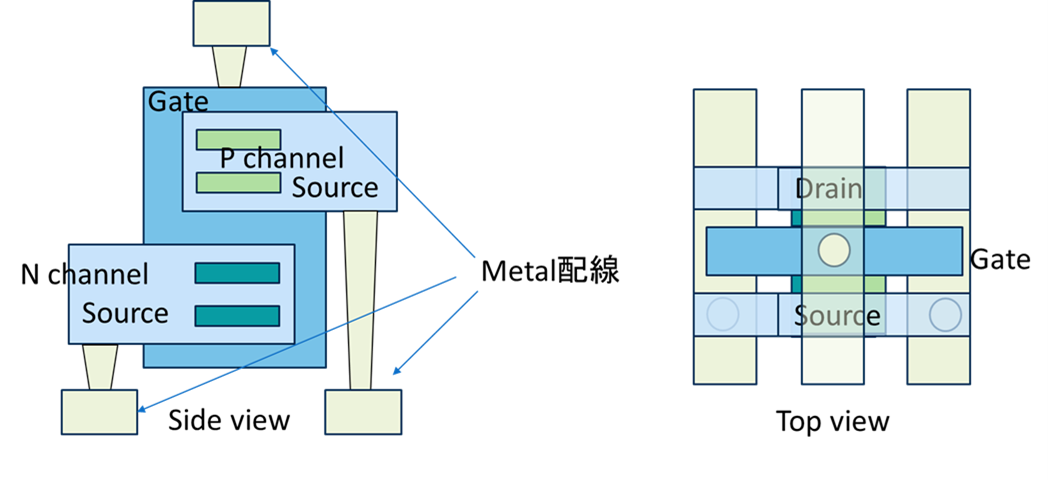 さらなる微細化(<10ナノメータ)の進展に対応するため考案されたのが、次のGAA(Gate All Around)構造です。この構成では、チャネルがソース・ドレイン間で上下左右の4つの面に対して形成されるのが特長です。図は、そのようなFETを2個並列に作りこんだ例です。製造工程は、さらに複雑になります。