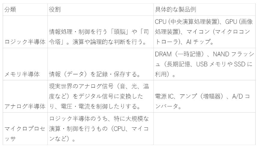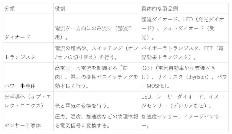 半導体(半導体デバイス)は、その機能、集積度、材料など、さまざまな視点から分類できます。最も一般的で実用的な用途・機能による分類と、近年特に重要な材料による分類を説明します。