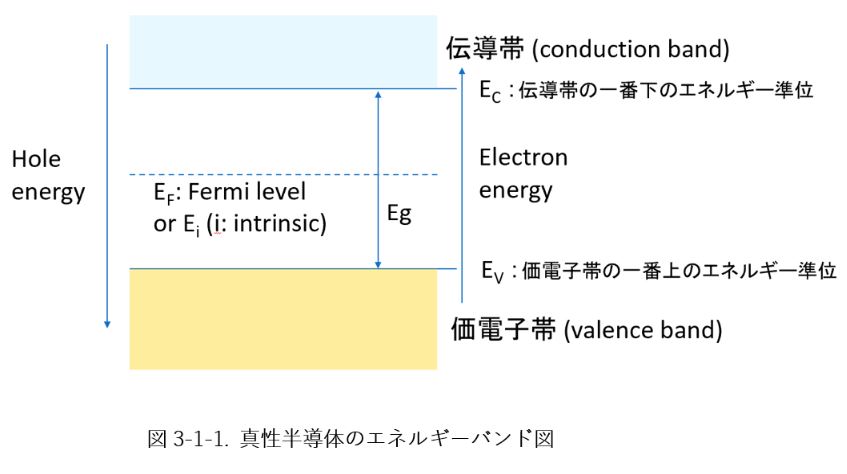 下図2-1-1は、真性 (intrinsic) 半導体を例に、価電子帯、導電帯、禁制帯を簡易的に図で表したものです。このような図は、エネルギーバンド図と呼ばれます。図で上に上がるほど電子のエネルギーは大きくなり、下に行くほど正孔のエネルギーが大きくなります。電子、正孔ともに、自然のかたちではエネルギーの大きい準位からエネルギーを放出してエネルギーの小さい準位(空きがあれば)に遷移しようとします。中央にあるフェルミレベルとは、量子力学で電子の存在確率が1/2になるエネルギー準位です。