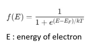 なお、フェルミ・ディラック統計(統計物理学)によると、電子が特性のエネルギー準位を占有する確率は、次のようになります。f(E) を、フェルミ・ディラックの分布関数と呼びます。ここで、Eは電子のエネルギーを示します。