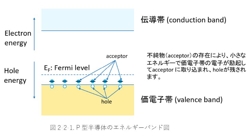 図2-2-1にP型半導体のエネルギーバンド図を模式的に示します。フェルミ準位が価電子帯に近くなっているのが分かります。また、アクセプターは、価電子帯のすぐ上のエネルギー準位に存在しています。