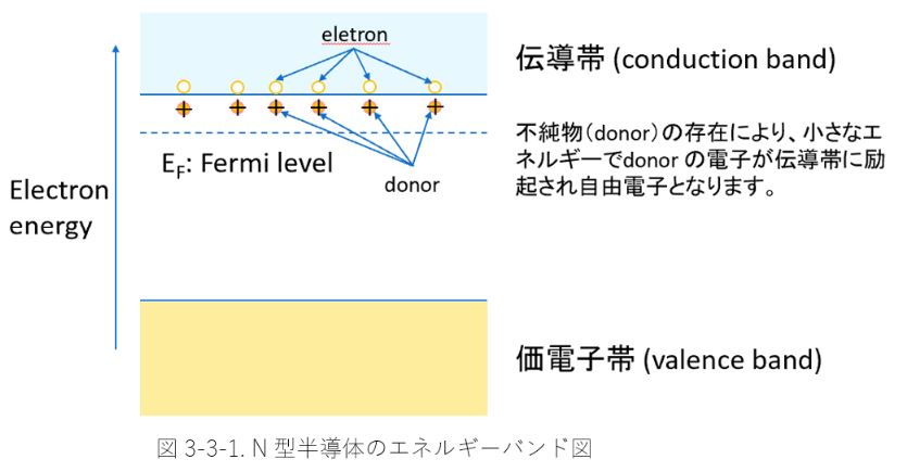 - 不純物 (dopant) : ドナー(donor : 電子を提供するという意味)。
