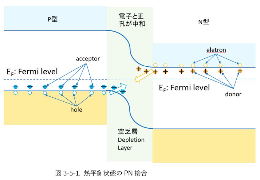 - 拡散: 接合直後、N側の多数キャリア(電子)がP側へ、P側の多数キャリア(正孔)がN側へ移動(拡散)し、互いに再結合して消滅します。