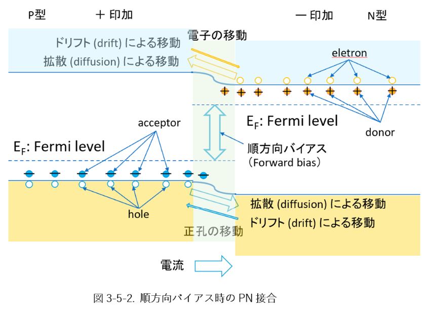 - 動作: 外部電圧が内部電界を打ち消すように働き、電位障壁が低くなります。これにより、N側の電子とP側の正孔が空乏層を越えて相手の領域に流れ込みやすくなり(キャリア注入: carrier injection)、再結合 (recombination)しながら電流が流れます。電位障壁を超えて相手の領域に流れ込むのは、多数キャリアの拡散 (diffusion) に依るもので、電位差(電界)により逆方向にも少数キャリアのドリフト (drift)による微量の流れ込みがあります。